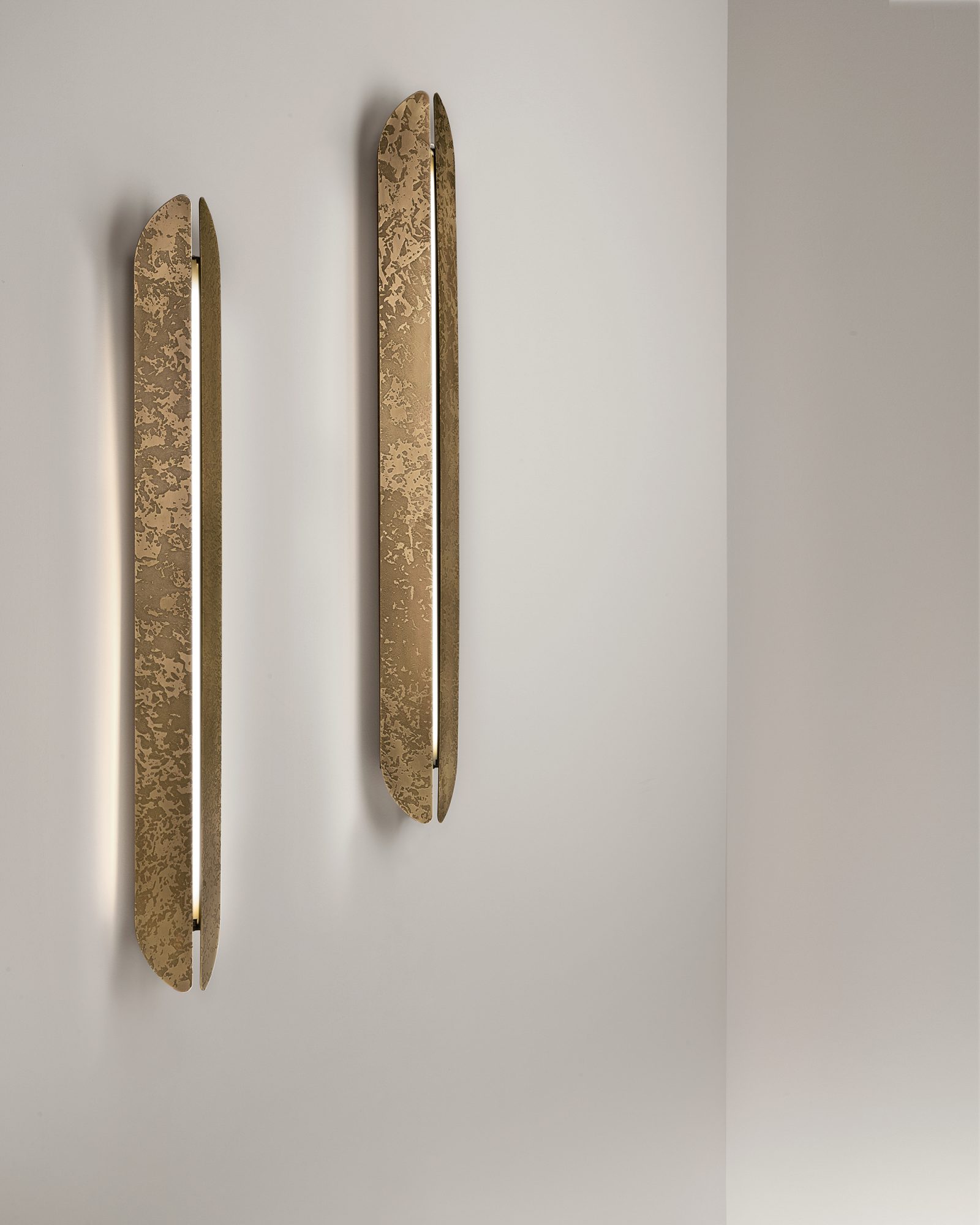 The Aare Gorge in Switzerland is testimony to natural erosion, shaped by the last ice age. Here, a river originating from melting glaciers once carved deep into the rock, cutting to its core. Thus, little by little, light began working its way into the cracks, amid ancient limestone stratifications. The manual erosion technique used on the sheet metal of Aare is its modern echo, recreating the natural look of the rock along its surfaces. Thanks to a centre slit, these wall sconces take on the archetypical form of earthly geography sculpted by ice, reproducing its prehistoric beauty, as if they too were forged centuries ago.