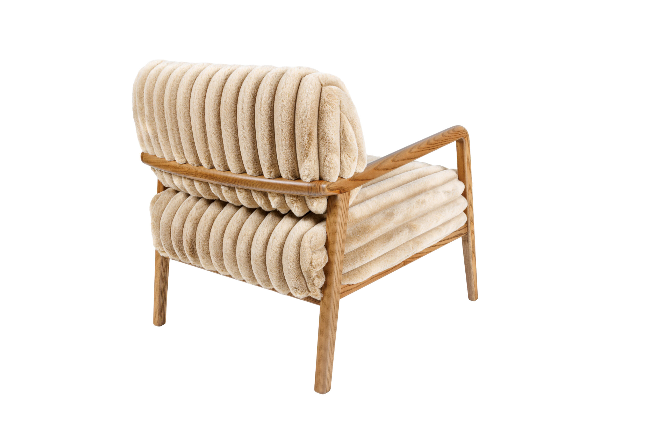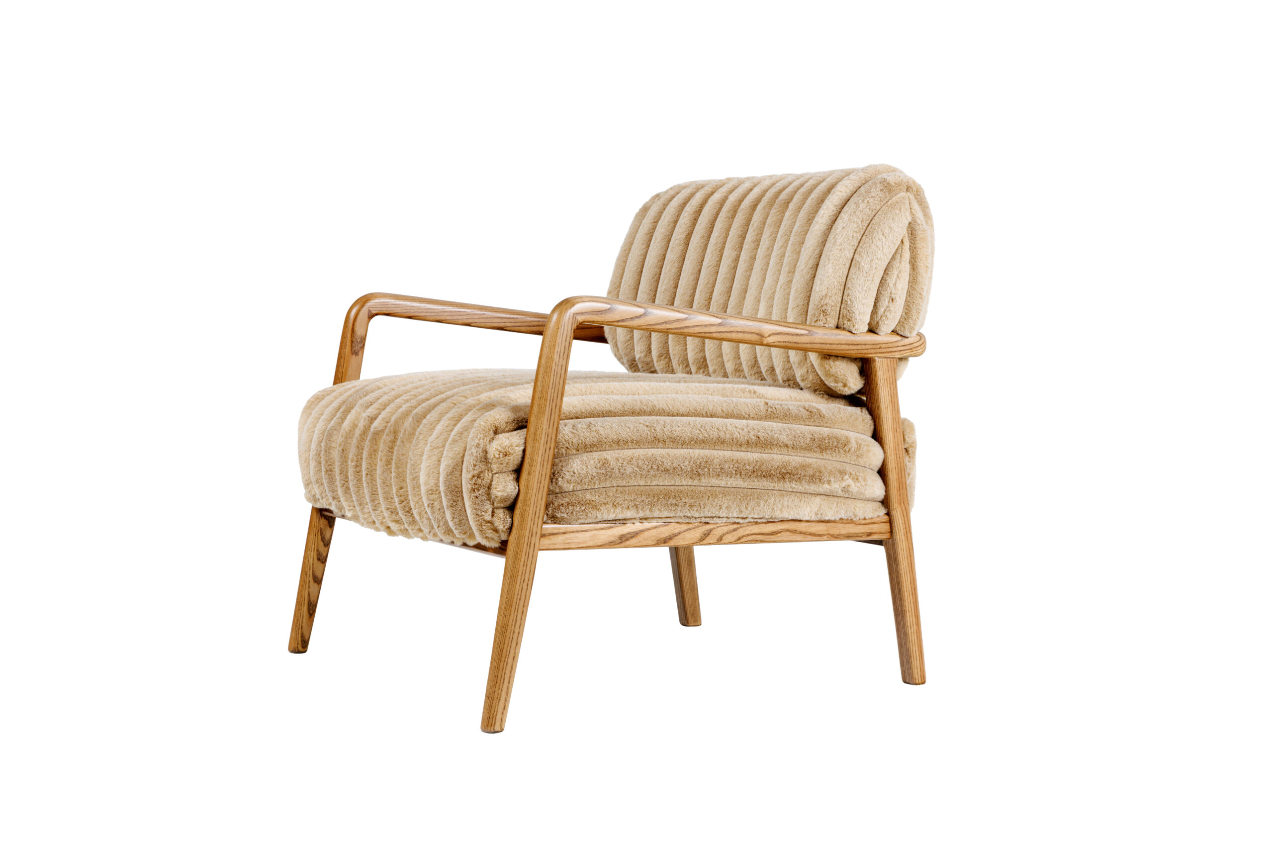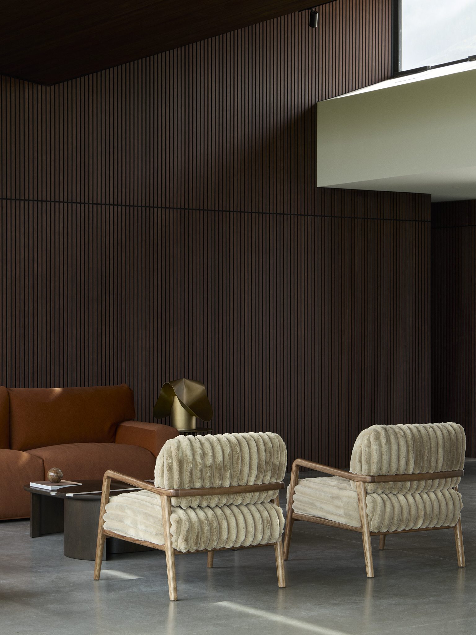 A statement in comfort and craftsmanship, this armchair blends sculptural timber detailing with deeply textured upholstery. The curved solid timber frame creates a warm architectural outline, while the generously padded seat and backrest feature a distinctive ribbed design that invites you to sit and relax.