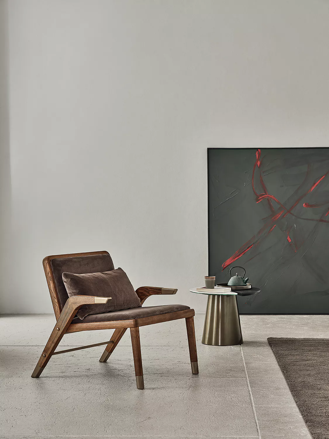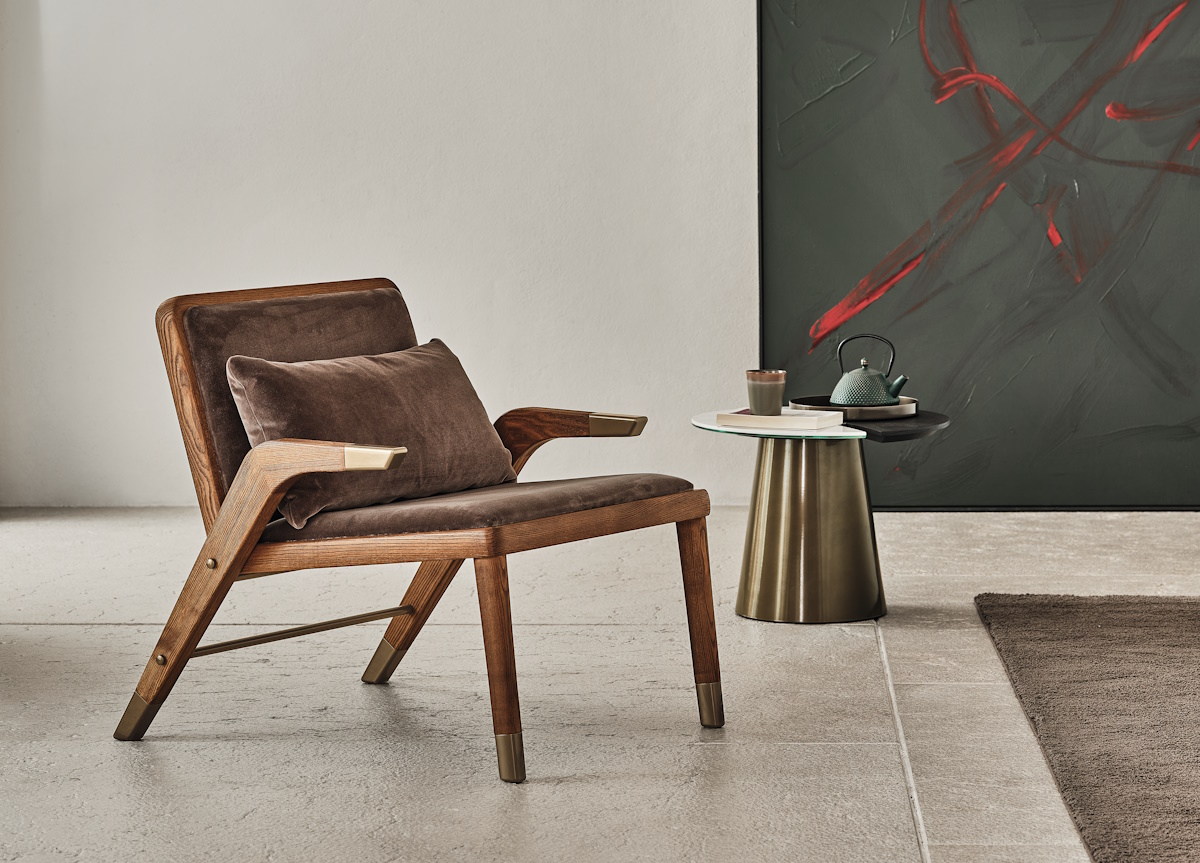 Armchair with solid wood frame stained upholstered and covered in Premium Bouquet fabric, Nordic fabric, Pure virgin wool, Supreme velvet, Kvadrat field fabric, Kvadrat coda fabric and Premium nappa leather.
